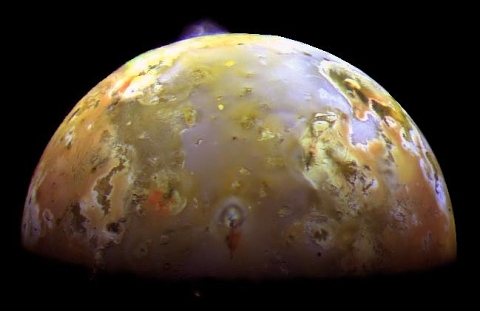 Der Vulkanismus und die hohe morphologische Aktivität des innersten Jupitermonds Io werden ebenfalls mit Gezeitenwechselwirkungen erklärt. Das Innere dieses Monds wird ständig umgewälzt und formt ein immer neu erscheinendes Io-Antlitz. Io hat es dadurch zur vulkanisch aktivsten Region im Sonnensystem gebracht. Die Aufnahme oben wurde mit der Raumsonde Galileo 1997 aus einer Höhe von 600000 Kilometern über Io fotografiert (Credit: Galileo Project, JPL/NASA, 1997; große Version). Auf dem Foto ist etwa in der Mitte eine blaue Rauchfahne zu sehen, die sich etwa 140 Kilometer über Ios Oberfläche erhebt. Sie stammt aus der Region Pillan Patera, die schon seit Jahren vulkanisch aktiv ist. Darunter, ebenfalls in der Bildmitte, jedoch nahe an der Trennlinie von Io-Tag und Io-Nacht (Terminator) befindet sich der Vulkan Prometheus, dessen Rauchfahne eine Ringform aufweist und etwa 75 Kilometer aufsteigt. Schon die Voyager-Sonden dokumentierten 1979 diesen aktiven Vulkan.