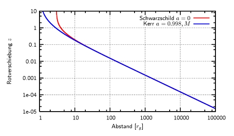 Die folgende Abbildung zeigt die Rotverschiebung als Funktion des Abstandes vom Schwarzen Loch. Es wurde dabei nicht nur die Gravitationsrotverschiebung berücksichtigt, sondern auch der (longitudinale und transversale) Doppler-Effekt. Im Modell kommt die Strahlung von einer Keplerscheibe aus der Äquatorebene. Wie man sieht nimmt die Rotverschiebung z (nicht zu verwechseln mit der kosmologischen Rotverschiebung!) beständig zu, wenn man dem Loch näher kommt. Abweichungen zwischen einem nicht-rotierenden Schwarzschild-Loch (rote Kurve) und einem schnell rotierenden Kerr-Loch (blaue Kurve) sind erst bei Radien kleiner als 4 Gravitationsradien erkennbar. Mit anderen Worten: so nahe muss der Emitter mindestens an das Loch kommen, um Lochrotation zu testen!