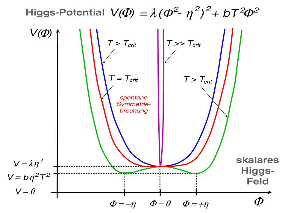 der Extrema und Wendepunkte und die Gleichung für die kritische Temperatur (siehe Gleichung links). An der Abbildung sieht man auch, dass der Vakuumerwartungswert des Higgs-Feldes (Moduli), der gerade mit der Potentialmulde assoziiert ist, nach der Symmetrieberechung absinkt. Denn das Feld wird jede Fluktuation ausnutzen, um von dem Potentialberg (instabile Gleichgewichtslage) 'abzurutschen' und in eines der beiden Minima zu gleiten, die stabile Zustände sind. Das ist eine wunderbare Analogie zu Gleichgewichtslagen in der klassischen Mechanik!