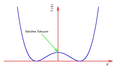Bei Abkühlung driftet der Vakuumzustand wieder in das falsche Vakuum. Dieser metastabile Zustand verhält sich wie ein Niveau niedrigster Energiedichte, hat aber tatsächlich eine Energiedichte, die größer ist, als diejenige des echten Vakuumzustandes. Das echte Vakuum befindet sich in den beiden Mulden des W-förmigen Potentials. Das lokale Maximum des W-Potentialverlaufs entspricht gerade dem falschen Vakuum.