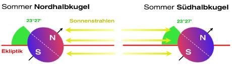 Die Neigung hat entscheidende Konsequenzen für die Beleuchtung der Erde bei ihrem Lauf um die Sonne. Wie die Illustration oben zeigt, treffen die nahezu parallelen Sonnenstrahlen mal die Südhalbkugel und mal die Nordhalbkugel mehr oder weniger senkrecht. Dort, wo das geschieht ist Sommer, während auf der gegenüberliegenden Halbkugel (bei den Antipoden) Winter ist. Die Sonnenstrahlen treffen übrigens deshalb nahezu parallel ein, weil die Sonne so weit entfernt ist, nämlich eine Astronomische Einheit (~ 150 Mio. Kilometer).
