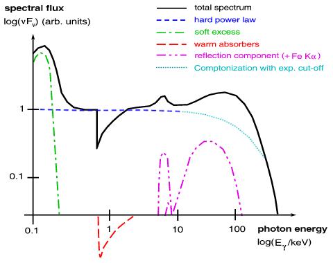Die koronale Primärstrahlung selbst befindet sich als thermisches Spektrum im UVX-Bereich. Niederenergetische Strahlung aus der Umgebung wird in der Korona Comptonisiert (inverse Compton-Streuung, IC) und wird so in hochenergetische Strahlung transformiert. Die dazu erforderlichen 'kalten Saatphotonen' können von der Standardscheibe oder dem kosmischen Hintergrund kommen. Treffen die kalten Photonen (in der Abbildung unten rot dargestellt) auf das heiße Koronagas, werden sie invers Compton gestreut und gewinnen dabei deutlich an Energie (blau dargestellt). Im Röntgenspektrum zwischen etwa einem und einigen hundert keV ist dieses Compton-Kontinuum klar zu detektieren. Durch den Energieverlust bei der Compton-Streuung kühlt das koronale Gas. Außerdem kann die Koronastrahlung bei bestimmten Geometrien auf die kalte Standardscheibe gestrahlt werden. Weil diese ionisiert ist, wirkt sie wie ein Spiegel und reflektiert die Koronastrahlung. Im Spektrum macht sich dieser Reflexionsbuckel (engl. reflection bump) bei etwa 20 keV bemerkbar (typisches Röntgenspektrum eines AGN Typ-1). Auf diese Weise können Röntgenastronomen direkte Strahlung aus der Korona und zeitversetzt indirekte Koronastrahlung, die an der Scheibe reflektiert wurde, detektieren. In diesem Zeitversatz steckt die Information von Laufzeitunterschieden der Strahlung. Das kann man sich zunutze machen, um die Geometrie der Korona herauszufinden. Diese Technik, wo man Beleuchtungseffekte und Spiegelungseffekte ausnutzt, heißt Reverberation Mapping (engl. reverberation: 'zurückstrahlen', to map: 'kartieren').