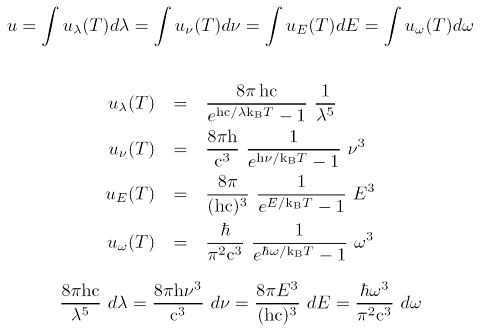 Generell berechnet sich die totale Energiedichte der Strahlungu = U/V aus einem Integral über die spektrale Energiedichte uν. Je nachdem, ob man über Wellenlänge λ, Frequenz ν bzw. ω = 2πν oder Energie E integriert, entscheidet man sich für eines der folgenden vier Integrale (große Version):