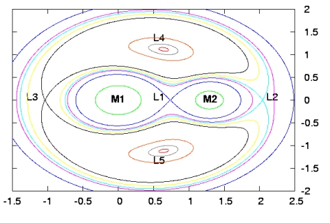 Man diskutiert das Potential, indem man Linien konstanten Potentials betrachtet. Einige dieser Isokonturlinien des Potentials sind unter das Gebirge projiziert worden. Die zweite Abbildung zeigt die Visualisierung der Isokonturlinien als zweidimensionales Diagramm. Diese so genannte Äquipotentiallinienstruktur zeigt charakteristische Punkte. Es handelt sich dabei um genau fünf Lagrange-Punkte in einem System von zwei Massen, M1 und M2. Sie sind im Diagramm von L1 bis L5 durchnummeriert. Die dreidimensionalen Roche-Volumina der Sterne entsprechen in der Isokonturliniendarstellung der blauen liegenden Acht. In dieser Berechnung wurde angenommen, dass die Masse M1 der Sonnenmasse und die Masse M2 nur einer halben Sonnenmasse entsprechen. Der Abstand der beiden Schwerpunkte M1 und M2 sei gerade so groß wie 1.3 Sonnenradien. Die beiden Raumachsen sind gerade in Einheiten des Sonnenradius beschriftet. Der interessante Punkt in der Ableitung der Roche-Flächen ist nun der innere Lagrange-Punkt L1. Er liegt genau auf der Verbindungslinie der beiden Massenschwerpunkte, zwischen den beiden Massen, am Kreuzungspunkt der Acht. Bei diesen Parametern liegt L1 näher bei der kleineren Masse M2. Das ist plausibel, muss ein Testteilchen doch viel näher an den leichteren Stern kommen, damit ein Gleichgewicht der Kräfte herrscht. Die Lagrangepunkte L2 und L3 liegen hinter den Sternen, jedoch ebenfalls auf der Verbindungslinien der beiden Massenschwerpunkte. Es gilt: L1, L2 und L3 sind kollinear. L4 und L5 sind hingegen außerhalb, bei diesen speziellen Parametern mehr als ein Sonnenradius von L1 entfernt.