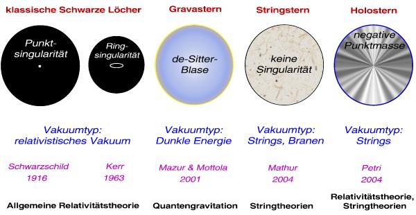 Im Jahr 2001 haben Physiker in der Theorie neue Alternativen zu den klassischen, singulären Schwarzen Löchern neben Bosonenstern und Fermionenstern gefunden. Diese neuen Raumzeiten haben keinen Ereignishorizont, und eine von ihnen kommt ohne Singularität aus und ist damit regulär. Der erste Vorschlag wurde von den Entdeckern P. Mazur & E. MottolaGravastern getauft (Mazur & Mottola 2001, gr-qc/0109035). Der äußerste Bereich des Gravasterns entspricht der Schwarzschild-Lösung, dann folgt eine dünne Schale eines ultrarelativistischen Plasmas, das durch eine innere 'Blase' Dunkler Energie stabilisiert wird. Gravasterne sind statisch; bisher wurde noch keine rotierende Verallgemeinerung gefunden.