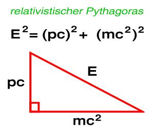 Der Spin ist eine relativistische Eigenschaft! Man kann ihn physikalisch nur erklären, wenn man die Konzepte der Quantenmechanik mit der Speziellen Relativitätstheorie verknüpft. Die fundamentalen Gleichungen dieser Dirac-Theorie, benannt nach dem britischen Physiker Paul Dirac (1902 – 1984), kann man recht schnell ableiten, wenn man die Größen E und p im relativistischen Energiesatz ('relativistischer Pythagoras', siehe Abbildung rechts) gemäß des Korrespondenzprinzips in Differentialoperatoren (E: Zeitableitung, p: Ortsableitung) übersetzt. Die resultierende Gleichung nennt man Klein-Gordon-Gleichung, die die Bewegungsgleichung des Elektrons ist. Sie ist zweiter Ordnung in der Ableitung nach Ort und Zeit und eine Wellengleichung.