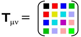 Physikalische Tensoren in der ART haben häufig 2. Stufe. Daher sind sie immer als quadratische, symmetrische Matrizen darstellbar. Die Raumzeit der ART ist vierdimensional (n = 4, eine Zeit- und drei Raumdimensionen), so dass Tensoren 2. Stufe als 4 × 4-Matrizen darstellbar sind. Schon ein Tensor 2. Stufe besteht deshalb aus 4 × 4 = 16 Komponenten. Im einfachsten Fall sind die Komponenten Zahlen (z.B. bei der Minkowski-Metrik), im Allgemeinen aber koordinatenabhängige Variablen (z.B. beim metrischen Tensor der Schwarzschild-Metrik). Auf jeden Fall kann man die Komponenten als Anordnung aus vier Spalten und vier Zeilen notieren. Eine solche Anordnung hat eine Hauptdiagonale, die in der ersten Zeile oben links beginnt, über das zweite Element von links in der zweiten Zeile und das dritte Element von links in der dritten Zeile geht und am rechten Element in der vierten Zeile endet (siehe Beispiel rechts). Die Symmetrie besagt nun, dass man an der Hauptdiagonalen spiegeln kann und somit z.B. das Element unten links mit demjenigen oben rechts übereinstimmen muss. In der Abbildung sind farbige Quadrate als Platzhalter für die Tensorkomponenten eingetragen worden. Dabei bedeutet, dass gleiche Farbe den gleichen Tensoreintrag hat. So wird Symmetrie eines Tensors zweiter Stufe unmittelbar anschaulich klar. Denn spiegelt man sorgfältig alle Elemente, so wird klar, dass von den 16 Elementen der symmetrischen Matrix nur 10 übrig bleiben, die wirklich unabhängig voneinander sind.