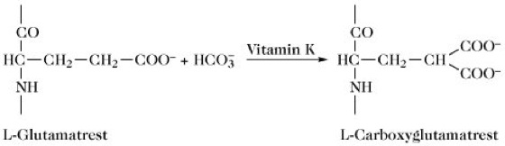 4-Glutamyl-Carboxylase, γ-Glutamyl-Carboxylase, Vitamin-K-abhängige γ-Glutamyl-Carboxylase, das Enzym, das für die posttranslationelle Carboxylierung von Glutamat- zu 4-Carboxyglutamatresten in bestimmten Proteinen verantwortlich ist (Abb.). Die Reaktion benötigt Vitamin K, wodurch sich der Vitamin-K-Bedarf von Blutgerinnungsproteinen erklärt, wie z. B. Prothrombin, das 4-Carboxyglutamatreste enthält. Es handelt sich um ein mikrosomales Enzym, das mit Hilfe verschiedener Detergenzien gelöst werden kann. Das mikrosomole System benötigt anscheinend ATP, während das solubilisierte Enzym keinen ATP-Bedarf aufweist. An dieser Carboxylierung ist Biotin nicht beteiligt.