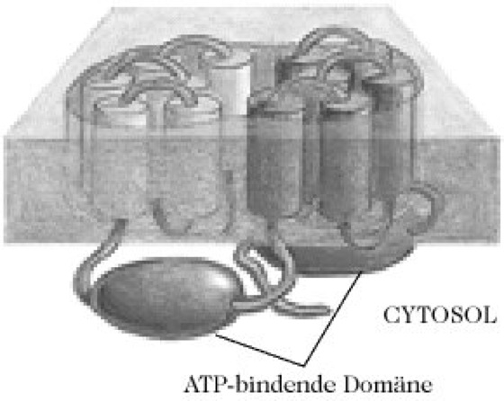 ABC-Transporter, ATP-bindende Cassetten-Transporter, eine Superfamilie von pro- und eukaryontischen Membrantransportproteinen, die ATP hydrolysieren und eine Vielzahl von Molekülen (Aminosäuren, anorganische Ionen, Mono- und Polysaccharide, Peptide oder Proteine) transportieren. Bisher sind über 50 A. bekannt. Alle A. bestehen aus vier Kerndomänen: zwei mit jeweils sechs Transmembranbereichen und zwei ATP-bindende Domänen, die sogenannten ATP-Bindungskassetten (Abb.). Diese Kassetten (funktionelle Domänen/Bereiche in einem Protein) sind die Grundlage für den energiegekoppelten Substrattransport gegen einen Konzentrationsgradienten. Die vier Domänen sind bei den verschiedenen A. auf unterschiedliche Weise angelegt – als individuelle Polypeptide oder fusioniert. Bei einigen dieser Transporter treten weitere Domänen mit regulatorischer Funktion auf. Die Proteine der Transporterfamilie sind sequenzhomolog. Die geringste Sequenzhomologie weisen die Transmembrandomänen auf, die für die Substratspezifität verantwortlich sind. Die A. sind in der Regel in der Cytoplasmamembran lokalisiert. Ausnahmen sind die TAP-Transporter (Peptid-Transporter) in der Membran des endoplasmatischen Reticulums und der cis-Golgi-Membran sowie ein Transportprotein der Peroxisomenmembran und ein Multidrug-Resistenz-Protein in der Membran der Verdauungsvakuole des Malariaparasiten Plasmodium falciparum. Bei Bakterien mit zwei Zellmembranen (z.B. E. coli) sind diese Transport-ATPasen in der inneren Membran lokalisiert, während sich in der äußeren Membran ein Hilfssystem befindet, das die zu transportierenden Metabolite aufnimmt und an die Transportproteine weiterreicht. Obgleich die meisten Mitglieder der A. in Prokaryonten beschrieben wurden, wächst die Zahl der in Eukaryonten entdeckten Transport-ATPasen ständig. Das Multidrug-Resistenz-Transportprotein (MDRP, engl. multidrug resistance protein), das wegen der Fähigkeit, hydrophobe Pharmaka aus Eukaryontenzellen zu pumpen, diese Bezeichnung erhielt, war unter den zuerst entdeckten eukaryontischen Transportsystemen. Weitere repräsentative Vertreter der A. sind die Chloroquin-Resistenz-ATPase in P. falciparum , das Sexual-Pheromon-Exportsystem bei Hefen, die Peptidpumpe in ER-Membranen bei Wirbeltieren, das mit der Mucoviscidose assoziierte CFTR-Protein (cystische-Fibrose-Transmembran-Regulatorprotein) u.a. [C.F. Higgins Annu. Rev. Cell Biol. 8 (1992) 67.]