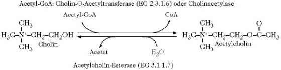 Acetylcholin.Abb. 1. Synthese (im Nervenende) und Abbau (in der Synapse) von Acetylcholin.: