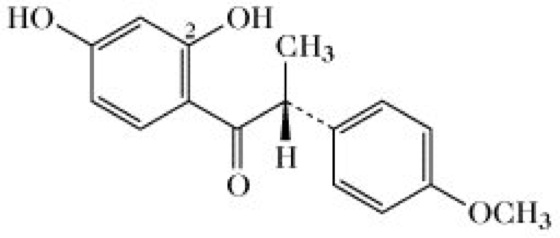α-Methyldesoxybenzoine, von dieser Gruppe sind nur zwei natürlich vorkommende Repräsentanten bekannt: Angolensin (Abb.) aus dem Kernholz von Pterocarpus-Arten und dem Holz von Pericopsis-Arten (Teakholz) sowie 2-O-Methylangolensin aus dem Holz von Pericopsis. In Pericopsis treten die α-M. gemeinsam mit den Isoflavonen Afrormosin und Biochanin A auf. Aus diesem Grund wird vermutet, dass die α-M. auch isoflavonoiden Ursprungs sind. [W.D. Ollis et al. Aust. J. Chem. 18 (1965) 1.787-1.790; M.A. Fitzgerald et al. J. Chem. Soc. Perkin 1(1976) 186-191]