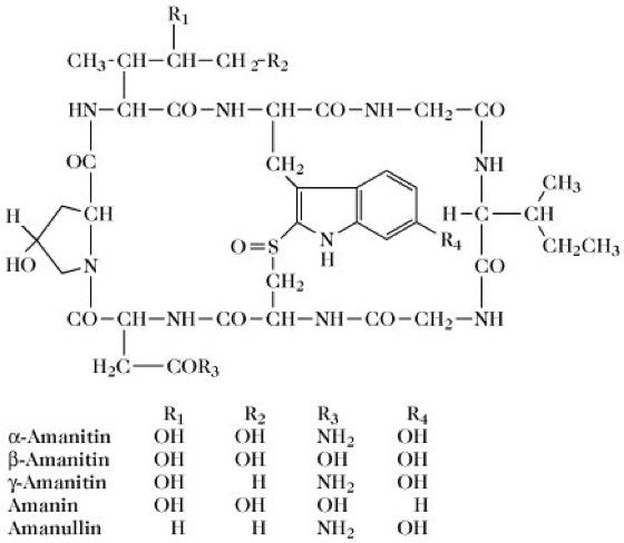 Amatoxine, eine Gruppe bizyklischer Octapeptide (Abb.), die neben den Phallatoxinen die wichtigsten Giftstoffe des grünen Knollenblätterpilzes (Amanita phalloides) sind.