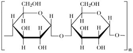 Amylose, gemeinsam mit Amylopektin Bestandteil der Stärke. A. ist ein unverzweigtes wasserlösliches Polysaccharid (Mr 50-200 kDa), das α-1→4-glycosidisch aus 300-1.000 D-Glucopyranosidresten aufgebaut ist (Abb.). Das der A. zugrunde liegende Disaccharid ist die Maltose. Im hydratisierten Zustand wird die Struktur der Polysaccharidkette durch Wasserstoffbrückenbindungen in einer linksgängigen Spirale festgehalten, die sechs Monosaccharideinheiten je Windung enthält. Der zentrale Kanal der Helix (Durchmesser 0,6nm) kann Moleküle mit passender Größe einlagern, z.B. Iod. Die A. bildet mit Iod charakteristische blaugefärbte Einschlussverbindungen, in denen die Iodatome lineare Ketten mit einem I-I-Abstand von 0,31nm bilden (Bindungsabstand im I2-Molekül beträgt 0,27nm). Beim Abbau durch α-Amylase entstehen etwa 90 % Maltose und 10 % D-Glucose. Schonender Abbau führt zu Dextrinen.