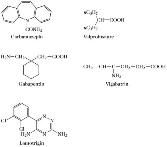Antikonvulsiva, Antiepileptika, Verbindungen, die das Auftreten zentral bedingter Krämpfe verhindern oder deren Intensität herabsetzen. Bei epileptischen Anfällen unterscheidet man zwischen dem mit tonischen und klonischen Krämpfen einhergehenden Anfall (Grand mal) und dem "kleinen Anfall" ohne generalisierte Krämpfe (Petit mal). Wichtige A. finden sich unter anderem in den Stoffklassen der Barbitale, der Hydantoine und der Succinimide (Ethosuximid). Ein wichtiges A. ist das Carbamazepin. Auch das stickstofffreie Valeriansäurederivat Valproinsäure ist in Gebrauch. Von der Tatsache ausgehend, dass γ-Aminobuttersäure (GABA) als natürlicher dämpfender Transmitter auftritt, sind stabilere Strukturverwandte von A., wie Vigabatrin und Gabapentin entwickelt worden. Ein Triazinderivat ist Lamotrigin, ein Glutaminsäureantagonist. (Abb.)
