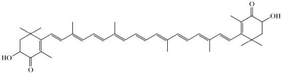 Astaxanthin, 3,3'-Dihydroxy-β,β-carotin-4,4'-dion, ein zur Gruppe der Xanthophylle gehörendes Carotinoid (Mr 596,82Da, F. 216°C, Abb.). A. ist als roter Farbstoff im Tierreich weit verbreitet, besonders bei Krebsen (Crustacea), Stachelhäutern (Echinodermata) und Manteltieren (Tunicata), aber auch in Vogelfedern und in der Fuß- und Beinhaut des Flamingos und anderer Vögel (bedingt durch gefressene Krebse). Da A. im Pflanzenreich nur selten auftritt, ist es als typisch tierisches Carotinoid anzusehen. Nativ liegt A. entweder in freier Form als roter Farbstoff, als Ester, z.B. als Dipalmitat, oder als blaues, grünes oder braunes Chromoprotein vor. Der im Panzer des Hummers Astacus gammarus enthaltene tief blauschwarze Farbstoff besteht aus einem Astaxanthin-Protein-Komplex, aus dem bei Denaturierung (z.B. beim Kochen des Hummers) das rote A., sowie farbloses Protein freigesetzt werden.