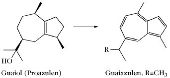 Ursprünglich bezeichnete man als A. die blauen hochsiedenden Anteile des Kamillenöls. Die so gewonnenen A. sind Artefakte, die erst beim Erhitzen oder Dehydrieren aus farblosen natürlichen Sesquiterpenen, den Proazulenen, entstehen. Aufgrund ihrer entzündungshemmenden Eigenschaften haben die A. medizinische Bedeutung erlangt. Aufbereitetes Kamillenöl enthält bis zu 15% Chamazulen (R = H). Guaiazulen (R = CH3) kommt in Geranienöl vor (Abb.).