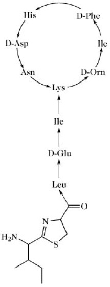 Bacitracine, lokal anwendbare Peptidantibiotika aus Bacillus licheniformis und Bacillus subtilis. B. wurde bereits 1943 entdeckt und besteht aus mindestens neun Peptidkomponenten. Die Hauptkomponente (etwa 70 %, Mr 1,4kDa) ist das B. A (Abb.). B. ist ein Inhibitor der Polyprenylpyrophosphat-Phosphatase und inhibiert durch Bildung eines Komplexes mit dem Undecaprenylpyrophosphat einen Teilschritt der bakteriellen Zellwandbiosynthese. B. besitzt ein breites Wirkungsspektrum besonders gegen grampositive Bakterien, vor allem Staphylococcen sowie Penicillin- und Sulfonamid-resistente Streptococcen. In Form seines Zinksalzes dient B. als Fütterungsantibiotikum in der Tierhaltung. Weiterhin findet es lokale Anwendung bei Verbrennungen, Wundinfektionen und Hauttransplantationen.