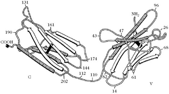 Bence-Jones-Proteine, Proteine, die im Urin von Patienten ausgeschieden werden, die an multiplen Myelomen leiden (bösartige Vermehrung antikörperproduzierender Zellen). Auf diese Proteine wurde man erstmals aufmerksam, als sie beim Erwärmen auf 50 °C ausfielen und sich beim weiteren Erwärmen auf 100 °C wieder lösten. Jedes B. besteht aus einem Dimer von Immunglobulin-L-Ketten (durch Disulfidbrücken zusammengehalten) und wird durch einen Klon identischer Zellen produziert (Abb.). Deshalb wird von jedem Patienten nur ein Polypeptid in einer Menge produziert, die für Sequenzbestimmungen ausreicht. Die B. waren für die Strukturbestimmung von Immunglobulinen sehr hilfreich. Jede leichte (L) Kette, Mr 22,5kDa, besteht aus 214 Aminosäuren. Es ist kein Methionin vorhanden und es gibt keine α-helicalen Bereiche.