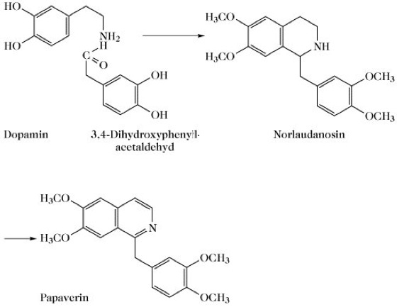 Benzylisochinolinalkaloide, eine Gruppe von hauptsächlich in Mohnpflanzen (Papaveraceae) vorkommenden Isochinolinalkaloiden. Der Benzylsubstituent am C1 des heterozyklischen Grundgerüsts ermöglicht verschiedene sekundäre Zyklisierungen als Folge einer Phenoloxidation. Auf diese Weise entstehen die Ringskelette der therapeutisch wichtigen Mohn-Alkaloide, Erythrina-Alkaloide und einiger Curare-Alkaloide, wobei letztere Bis-B. sind. Papaverin und die sich von ihm ableitenden Alkaloide entstehen bei der Biosynthese aus zwei Molekülen Dopa, von denen das eine in Dopamin, das andere in 3,4-Dihydroxyphenylacetaldehyd umgewandelt wird. Durch eine Mannich-Kondensation bildet sich zunächst das Tetrahydroisochinolin Norlaudanosin, das danach zu Papaverin dehydriert wird (Abb. 1).