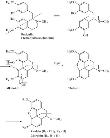 Die Tetrahydroisochinolinbasen sind darüber hinaus Vorläufermoleküle der Alkaloide mit Morphinangrundgerüst (z.B. Thebain, Codein, Morphin). Ein mit Hilfe der Monophenol-Oxidase (EC 1.14.18.1) gebildetes Biradikal wird zu Reticulin umgesetzt, das dann über das tetrazyklische Alkaloid I in Thebain umgewandelt wird. Dessen Überführung in Codein und Morphin wird durch Entmethylierung einer Methoxygruppe eingeleitet (Abb. 2). Durch weitere Dehydrierung bildet sich Morphin.