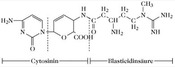 Blasticidine, von Streptomyces griseochromogenes synthetisierte Pyrimidinantibiotika (Nucleosidantibiotika). Sie inhibieren das Wachstum von Pilzen, z.B. des Reispilzes Piricularia oryzae, und einiger Bakterien. Der Wirkungsmechanismus beruht auf der Unterdrückung der Polypeptidkettenverlängerung bei der Proteinbiosynthese. (Abb.)