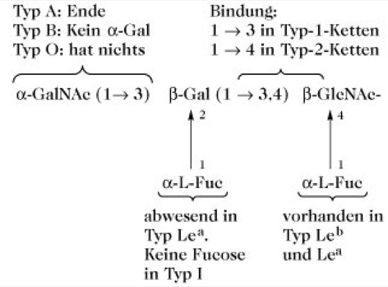 Die strukturellen Unterschiede zwischen den AB0-Oligosacchariden werden in Abb. 1 gezeigt. Die genetische Basis für diese Gruppen ist die Existenz von drei Allelen eines Gens, das für die Synthese einer Glycosyl-Transferase codiert. Bei Individuen des A-Typs überträgt das Enzym N-Acetylgalactosamin auf die endständigen Positionen der Oligosaccharidketten, während das Enzym bei Personen des B-Typs spezifisch für Galactose ist. Das O-Gen produziert anscheinend ein inaktives Enzym. Ein anderes Gen (das H-Gen) codiert für eine Fucosyltransferase, die L-Fucose auf das Oligosaccharid überträgt. Wenn das H-Gen inaktiv ist, besitzt das Individuum die seltene Blutgruppe Typ I, sofern ein aktives Le-Gen vorhanden ist (Le bedeutet Lewis-Faktor). Das Le-Gen codiert für ein Enzym, das Fucose an N-Acetylglucosamin addiert. Individuen, denen ein aktives H-Gen fehlt, die aber ein aktives Le-Gen besitzen, haben die Blutgruppe Lea. Wenn sowohl das H- als auch das Le-Gen aktiv sind, liegt der Blutgruppentyp Leb vor.