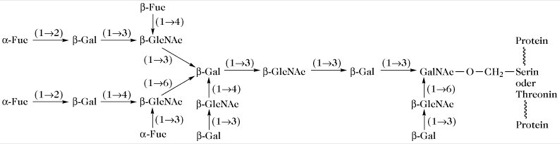 Ungefähr 80 % der Bevölkerung besitzt ein aktives Se-Gen (Se bedeutet Sekretion), so dass sie Glycoproteine in den Speichel oder andere Körperflüssigkeiten sekretieren können, die die B. tragen. Die Struktur des Kohlenhydratteils eines solchen Glycoproteins wird in Abb. 2 gezeigt.