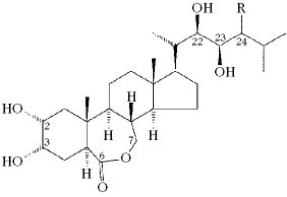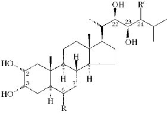 Brassinosteroide, eine Klasse wachstumsfördernder Steroide, die in höheren Pflanzen weit verbreitet sind (Pollen und Samen 1-1.000 ng/kg; Triebe 100 ng/kg; Früchte und Blätter 1-10 ng/kg) und auch in niederen Pflanzen, einschließlich der Cyanobakterien, gefunden wurden. Das erste B. wurde 1979 aus Rapspollen (Brassica napus) isoliert: das Brassinolid (2α,3α,22(R),23(R)-Tetrahydroxy-24(S)-methyl-B-homo-7-oxa-5α-cholestan-6-on) [M.D. Grove et al. Nature281 (1979) 216-217]. Bis jetzt sind ungefähr 30 natürlich vorkommende B. bekannt und es wurde eine Reihe von Analoga synthetisiert. Im "zweites Bohneninternodium"-Wachstumstest, der die "Brassinaktivität" von der Aktivität anderer Hormone differenziert, wurden die Analoga getestet und damit die strukturellen Eigenschaften aufgezeigt, die für die einzigartige biologische Aktivität der B. benötigt werden. Im Einzelnen sind dies: 1) ein cis-vicinaler Glycolteil an C2/C3, 2) eine trans-Verbindung zwischen den Ringen A und B, 3) eine Sauerstofffunktion an C6 in Form eines Ketons oder Lactons, 4) ein vicinaler Glycolteil an C22/C23 (für eine maximale Aktivität sollte an beiden Kohlenstoffatomen eine R-Konfiguration vorliegen, d.h. beide Hydroxylgruppen sollten nach der modifizierten Fischerformel α-orientiert sein) und 5) eine kurze Alkylgruppe an C24, die die 24S-Konfiguration bewirkt (d.h. α-orientiert ist); die Aktivität nimmt in der Reihenfolge Me > Et > H ab. Beim "zweites Bohneninternodium" Bioassay wird die in Lanolin dispergierte Testverbindung auf das zweite (ca. 2mm lange) Internodium eines sechs Tage alten Phaseolus vulgaris-Keimlings gestrichen. Die Brassinosteroidaktivität wird durch eine Verlängerung, Krümmung, Verdickung und Spaltung des Internodiums angezeigt, die nach vier Tagen sichtbar wird. Obwohl es erwiesen ist, dass B. das Wachstum durch eine Kombination von Zellteilung und Vergrößerung in jungen wachsenden Geweben, besonders Meristemen, fördern und diese Ergebnisse auf Pflanzen übertragen werden können, ist ihre physiologische Rolle nicht klar. Da B. in niedrigen Konzentrationen (1-100 μg/l) auf Pflanzen wachstumsfördernd wirken, wird ihre Einsatzmöglichkeit in der Landwirtschaft getestet. Über ihre Biosynthese ist wenig bekannt. Möglicherweise stammen sie von gewöhnlichen Pflanzensterinen ab, die durch Hydroxylierungen und im Fall der Ring B-Lactone durch eine Art Baeyer-Villiger-Oxidation eines 6-Oxosteroids derivatisiert werden (Tab. 1 und Tab. 2). [N.B. Mandava Annu. Rev. Pl. Physiol Pl. Mol. Biol. 39 (1988) 23-52; H.G. Cutleret et al. (Hrsg.) Brassinosteroids: chemistry, bioactivity and applications, ACS Symposium Series No. 474 (1991), American Chemical Society, Washington, DC]