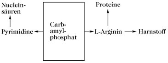 C. wird de novo oder durch Phosphorolyse von Ureidverbindungen gebildet. Die Neusynthese erfolgt unter der Wirkung von drei verschiedenen Enzymen: