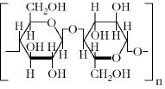 Cellulose, ein unverzweigtes pflanzliches Polysaccharid – Mr 300-500 kDa; Summenformel (C6H10O5)n –, das aus β-1→4-glycosidisch verbundenen Glucoseeinheiten besteht (Abb.). Durch Enzyme wird Cellulose zum Disaccharid Cellobiose hydrolysiert. Bei der Behandlung von C. mit konzentrierten Säuren, z.B. 40 %iger Salzsäure oder 60-70 %iger Schwefelsäure oder mit verdünnten Säuren bei erhöhter Temperatur wird C. in D-Glucose gespalten. Bei diesem als Holzverzuckerung bezeichneten Prozess wird C. in gärfähigen Zucker überführt.