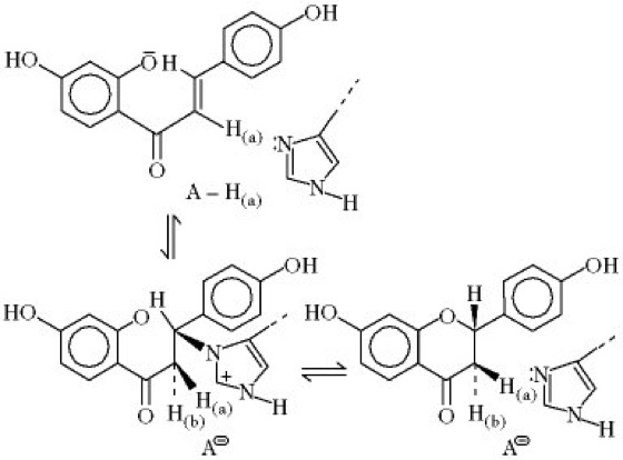 Chalkon-Isomerase. Vorgeschlagener Mechanismus für die Wirkung der Chalkon-Isomerase. [M.J. Boland u. E. Wong Bioorg. Chem. 8 (1979) 1-8]. Der nucleophilen Addition einer Imidazolgruppe im aktiven Zentrum des Enzyms an die Doppelbindung folgt der nucleophile Angriff durch das 2'-Phenolation. A-H kann entweder eine acide Seitenkette oder ein Wassermolekül sein.