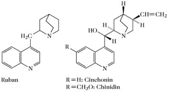 China-Alkaloide, Chinarinden-Alkaloide, eine Gruppe von Alkaloiden mit Chinolinringsystem, die sich in den Rinden verschiedener Cinchona-Arten (Chinarinde) finden (Farbtafel). In industriell verwerteten Rinden besonderer Zuchtformen kann der Gesamtalkaloidgehalt bis zu 17% betragen. Insgesamt wurden über 25 C. aus Chinarinde isoliert. Hauptalkaloide sind Chinin, Chinidin, Cinchonin, Mr 294,40 Da, F. 264°C, [α]D 224° (Alkohol), und Cinchonidin. Die C. bestehen aus dem heteroaromatischen Chinolinringsystem und dem heteroaliphatischen Chinuclidinringsystem, die über eine Hydroxymethylengruppe verknüpft sind (Ruban, Abb. 1). Der Chinolinring der China-Alkaloide entsteht im Verlauf der Biosynthese (Abb. 2) aus der Aminosäure Tryptophan über Tryptamin, der Chinuclidinkern aus iridoiden Verbindungen. Cinchonamin, Mr 296,42Da, F. 207°C, [α] ![]()