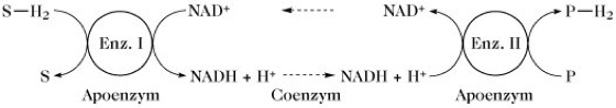 Coenzym. Die Rolle von NAD als Coenzym bzw. Cosubstrat bei der Dehydrierung und Hydrierung. Enz. I = Triosephosphat-Dehydrogenase, Enz. II = Alkohol-Dehydrogenase; S und S-H2 = oxidiertes und reduziertes Substrat; P und P-H2 = oxidiertes und reduziertes Produkt.