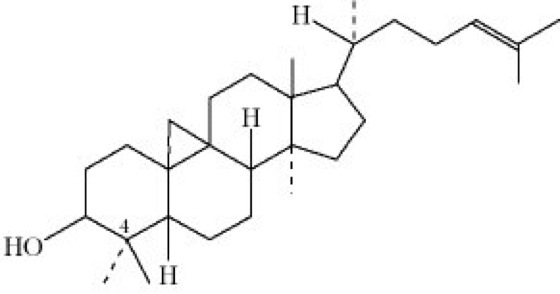 Cycloartenol, 9,19-Cyclo-5α,9β-lanost-24-en-3β-ol (Abb.), ein tetrazyklischer Triterpenalkohol; Mr 426,73Da, F. 115°C, [α]D 54°. C. tritt im Pflanzenreich weit verbreitet auf und wurde z.B. im Milchsaft von Wolfsmilchgewächsen (Euphorbiaceae), in der Kartoffel (Solanum tuberosum) und der Brechnuß (Strychnos nux vomica) nachgewiesen. Die Biosynthese erfolgt aus Squalen über 2,3-Epoxysqualen (Steroide, Abb. 6).