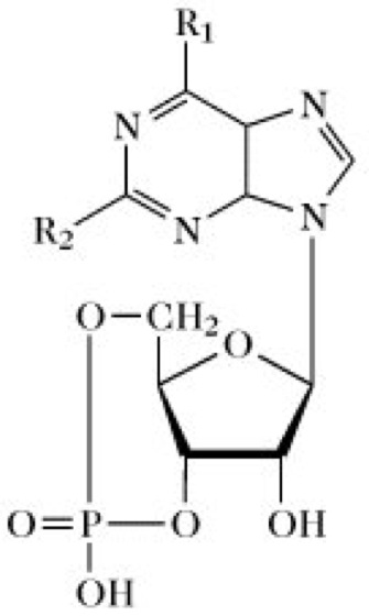 Cyclonucleotide, Nucleotide, bei denen ein Phosphorsäurerest mit zwei funktionellen Gruppen eines Nucleosidmoleküls verbunden ist (Abb.). Von besonderer biochem. Bedeutung sind die 3',5'-C. von Adenosin und Guanosin; das Adenosin-3',5'-phosphat (zyklisches Adenosin-3',5'-monophosphat, Abk. cAMP, Adenosinphosphate) und das Guanosin-3',5'-phosphat (zyklisches Guanosinmonophosphat, Abk. cGMP, Guanosinphosphate), die als sekundäre Botenstoffe (engl. second messenger) eine Rolle bei der Informationsübertragung des durch Peptidhormone an der Membran ausgelösten Signals spielen. C. sind hydrophil und können die Zellmembran nicht durchdringen.