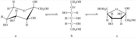 D-Fructose. Gleichgewicht in wässriger Lösung zwischen der 6-gliedrigen Ringstruktur der β-D-Fructopyranose (a), der offenen Kettenstruktur (b; Fischerkonvention) und der 5-gliedrigen Ringstruktur der β-D-Fructofuranose (c).