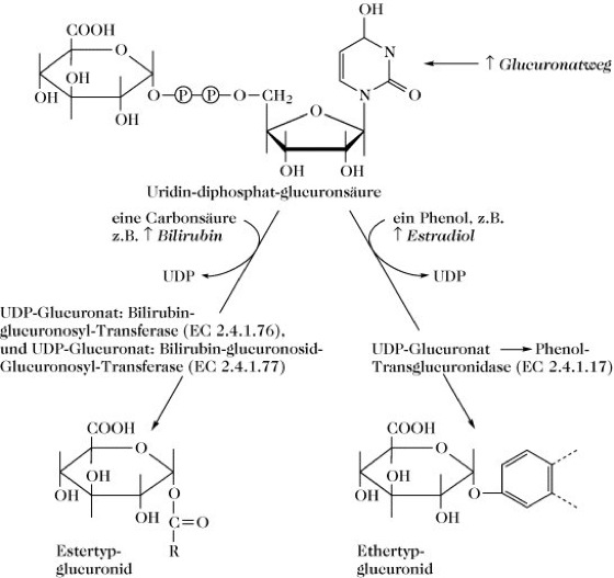 Abb. 2. D-Glucuronsäure. Bildung von Glucuronsäurekonjugaten (Glucuronide bzw. Glucuronoside). Die UDP-Glucuronat:Phenol-Transglucuronidase (EC 2.4.1.17) katalysiert die Glucuronidierung einer großen Reihe von Phenolen, Alkoholen und Fettsäuren. Die Glucuronidierung von Bilirubin stellt einen wichtigen Sonderfall dar (Crigler-Najjar-Syndrom).