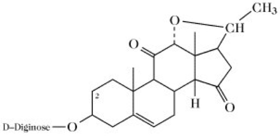 Diginin, ein Digitanol, das sich aus dem Pregnanderivat Diginigenin (Mr 344,45Da, F. 115°C, [α]D -126°) und dem Desoxyzucker D-Diginose zusammensetzt (Abb.). D. tritt als Begleiter von herzwirksamen Glycosiden in Fingerhutarten auf, beispielsweise in Digitalis purpurea, aus dem es 1936 von Karrer isoliert wurde.
