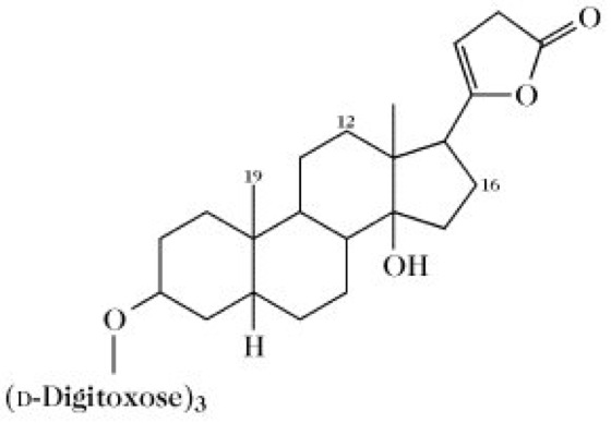 4,8° (c = 1,2 in Dioxan), Abb. –, Digoxin – Mr 780,96Da, F. 265°C (Zers.), [α]D 11° –, und Gitoxin – Mr 780,96Da, F. 285°C (Zers.), [α]D 22°. Sie entstehen als Sekundärglycoside bei der Aufarbeitung der Digitalisblätter aus den ursprünglich in der Pflanze vorliegenden genuinen Primärglycosiden, den Lanatosiden, durch Abspaltung von D-Glucose und esterartig gebundener Essigsäure. Die im Digitoxin, Digoxin und Gitoxin vorliegenden steroiden Aglyca heißen Digitoxigenin – Mr 374,52Da, F. 253°C, [α] ![]()
