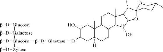 -54° (c = 0,45g in 15,8ml Methanol), Abb.. Es besteht aus dem vom Spirostan abgeleiteten Aglycon Digitogenin, (25R)-5α-Spirostan-2α,3β,15β-triol, Mr 448,65Da, F. 296°C (Zers.), [α] ![]()
