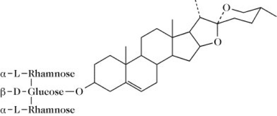 -115° (c = 0,373 in Ethanol), Abb.. Das Aglycon des D. ist Diosgenin, (25R)-Spirost-5-en-3β-ol (Mr 414,61Da, F. 204-207°C). D. kommt in Yamswurzel (Dioscorea) und Trillium-Arten vor. Diosgenin ist ein wichtiges Ausgangsmaterial zur Partialsynthese von Steroidhormonen.