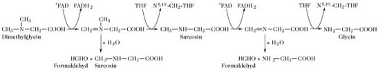 Die Dehydrierung von Sarcosin und Dimethylglycin ist eng mit der Umwandlung von Glycin in Serin über den Zyklus zur Verwendung und Regenerierung von N5,10-CH2-THF beteiligt. Sarcosin und Dimethylglycin, die aus Rattenleber isoliert wurden, besitzen ein fest (jedoch nichtkovalent) gebundenes THF-Derivat mit einer Kette aus fünf Glutamatresten. Dieses THF(Glu)5 tritt möglicherweise an die Stelle von THF in den unten gezeigten Reaktionen. Bei Abwesenheit von THF findet die Oxidation von Dimethylglycin und Sarcosin weiterhin statt, die Produkte sind jedoch Glycin und Formaldehyd. Diese werden möglicherweise durch Hydrolyse der enzymgebundenen Oxidationsprodukte gebildet (Abb. 1)