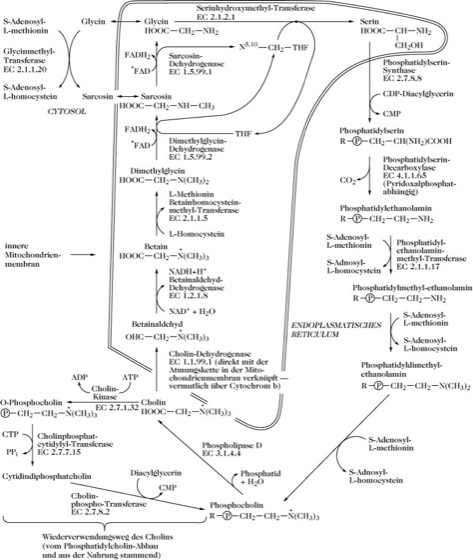 Einkohlenstoff-Zyklus, ein Zyklus der Methylübertragung und Methyloxidation, an dem Glycin, Sarcosin, Dimethylglycin, Betain und Cholin beteiligt sind. Er wurde erstmals 1958 aufgrund der Beobachtung vorgeschlagen, dass Dimethylglycin und Sarcosin durch Rattenlebermitochondrien oxidiert werden [Mackenzie u. Frisell, J. Biol. Chem. 232 (1958) 417-427]. Die Existenz eines E.-Z. ist mittlerweile erwiesen. An diesem Zyklus ist die Cholinoxidation in den Mitochondrien und die Phosphatidylcholinsynthese im endoplasmatischen Reticulum beteiligt (Abb. 2). [A.J. Wittwer u. C. Wagner J. Biol. Chem. 256 (1981) 4.102-4.108, 4.109-4.115]