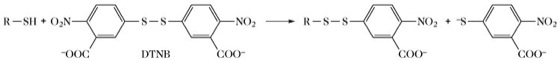 Ellman-Reagens, DTNB, 5,5'-Dithio-bis(2-nitrobenzoesäure), ein Reagens zur Detektion und Quantifizierung von Thiolfunktionen in Proteinen (Abb.). Das bei der Reaktion freigesetzte Thionitrobenzoat-Anion kann wegen seines hohen Absorptionskoeffizienten spektroskopisch leicht bestimmt werden.