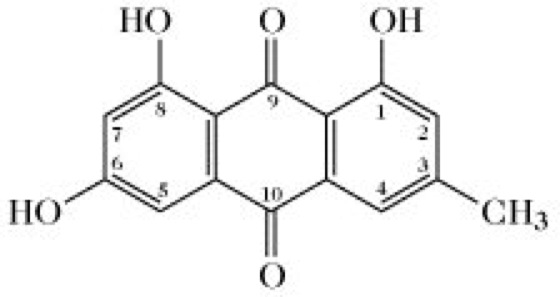 Emodin, ein orangefarbener Anthrachinonfarbstoff (Abb., F. 225°C), der als Glycosid oder als Dimer (Skyrin) weit verbreitet ist. Das 5,5'-Dimer, (+)-Skyrin (F. 380 °C), kommt in Penicillium-Arten vor. Es ist in zahlreichen höheren Pflanzen, z. B. Rhabarberwurzeln, Faulbaum (Rhamnus frangula L.), Cascara sagrada enthalten. E. wird als Kathartikum verwendet.