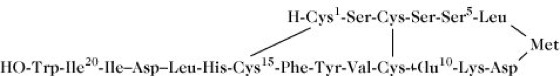 Endotheline, von den Endothelzellen sezernierte Peptide und andere Verbindungen, wie Prostacyclin und der später als Stickstoffmonoxid identifizierte endotheliale vasodilatierende Faktor (EDRF), die die regulierende Wirkung von Endothelzellen auf den Blutdruck vermitteln. Endothelin-1, ein 21AS-Peptid mit zwei intrachenaren Disulfidbrücken (Abb.) zeigt eine 10mal stärkere Wirkung als Angiotensin II (Angiotensin). Es wird biosynthetisch aus einem Prä-Pro-Endothelin (203 Aminosäurebausteine) über Pro-Endothelin gebildet. Pro-Endothelin (Big-Endothelin) besteht aus 39 Aminosäureresten. Subpolulationen von Endothelin-Rezeptoren können zwischen E.-1, E.-2 und E.-3 unterscheiden. Therapeutisch sind die E.-1-selektiven Antagonisten von Bedeutung für die Behandlung von Bluthochdruck und Arteriosklerose.