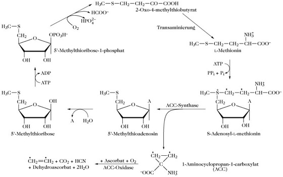 Ethylen, Ethen, Fruchtreifungshormon, ein gasförmiges Pflanzenhormon, das in pflanzlichem Gewebe weit verbreitet ist und die Fruchtreifung, den Blatt- und Fruchtabfall, sowie das Altern der Pflanze beschleunigt (Mr 28,05Da, Sdp. -102,4°C). Exogenes E. bewirkt ein schnelleres Reifen und Ausfärben von Früchten und induziert Blühen und Samenkeimung. Die Ethylenbiosynthese nimmt als Einleitung der entwicklungsbedingt programmierten Seneszenz und als Antwort auf umweltbedingten Stress zu. Es wird vermutet, dass der Ethylenrezeptor ein Zn2+- bzw. Cu2+-enthaltendes Metalloprotein ist, der jedoch noch nicht charakterisiert wurde. Die beiden Kohlenstoffatome des E. stammen biosynthetisch gesehen von den beiden Methylengruppen des L-Methionins ab, wobei 1-Aminocyclopropan-1-carboxylat (ACC) auftritt. Die Produktion von ACC ist mit einem Reaktionszyklus, dem sog. Yang-Zyklus, verknüpft, in welchem die Methylgruppe und der Schwefel des L-Methionins zurückgewonnen werden und der Rest des L-Methioninmoleküls kontinuierlich auf Kosten der Kohlenstoffatome von Ribose neu synthetisiert wird (Abb.). Dieser kontinuierliche Ersatz von L-Methionin ist wahrscheinlich notwendig, weil es eine der am wenigsten verbreiteten Aminosäuren ist. Wenn fünf Kohlenstoffatome den Zyklus in Form von ACC verlassen, werden sie durch Inkorporation des Adenosinteils von ATP aufgefüllt. Der Zyklus wird durch das cytosolische Enzym 1-Aminocyclopropan-1-carboxylat-Synthase (ACC-Synthase) katalysiert. Die ACC-Synthese stellt den geschwindigkeitsbestimmenden Schritt der Ethylensynthese dar. Faktoren, die die Synthese von E. fördern (Auxin, Cytokinine + Auxin, Ca2+ + Cytokinine, E. selbst und Stressfaktoren, wie Verletzung, Anaerobiose, Hitze, Kälte, Cd2+, Li+, UV-Licht und Pathogene) bewirken eine Aktivitätszunahme der ACC-Synthase. Die Umwandlung von ACC in E. wird durch ein membrangebundenes Enzym, die ACC-Oxidase (mögliche Membranstellen sind der Tonoplast und das Plasmalemma) katalysiert. Die Reaktion benötigt molekularen Sauerstoff und Ascorbat. CO2 wirkt in vivo als Stimulator und das gereinigte Enzym zeigt in vitro einen bestimmten Bedarf an CO2. Die Rolle des CO2 in Bezug auf die Stöchiometrie der Umsetzung ist jedoch nicht ersichtlich. Es wird auch Fe2+ benötigt, das vermutlich ein normaler Bestandteil des Enzyms ist. Die Stöchiometrie der Reaktion wird in der Abb. dargestellt.