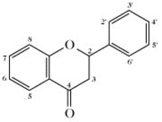 Flavanon, ein Flavonoid, mit dem in der Abb. gezeigten Ringsystem.