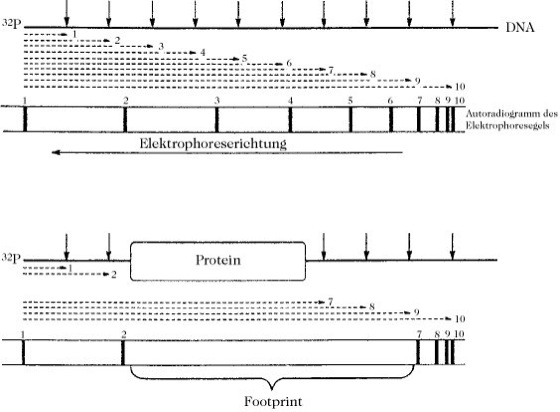 Bei der DNase-I-Technik wird die mit Protein komplexierte, endmarkierte DNA mit DNase I unter milden, regulierten Bedingungen inkubiert, so dass im Durchschnitt nur eine Spaltungsstelle ("Nick") je DNA-Molekül entsteht. Zur Kontrolle wird eine Probe der gleichen endmarkierten DNA, die nicht mit Protein komplexiert wurde, auf ähnliche Weise mit DNase I behandelt. Beide DNA-Proben werden denaturiert und nebeneinander in einem Sequenzierungsgel einer Elektrophorese unterworfen (die Fragmente werden nach der Größe getrennt). Die Autoradiographie der Gele zeigt, dass die Kontroll-DNA zufällig gespalten wurde und eine nicht unterbrochene Leiter an radioaktiven Nucleotiden erzeugt hat. Das Autoradiogramm der DNase-I-verdauten, proteinkomplexierten DNA weist eine ähnliche, jedoch unterbrochene Leiter auf (d. h. die Nucleotidenleiter enthält eine Lücke bzw. einen Footprint), weil bestimmte potenzielle Spaltungsstellen durch das gebundene Protein vor der DNase-Wirkung geschützt werden (Abb.). Alle Banden der vollständigen Leiter besitzen das gleiche 5'-Ende. Sie entsprechen den Spaltungsprodukten, die sich um jeweils ein Nucleotid unterscheiden und vom 5'-Mononucleotid bis zu den Nucleotiden reichen, die n – 1 und am Schluss n Nucleotidreste enthalten, wobei n die Gesamtzahl der Nucleotidreste in einem DNA-Einzelstrang (bzw. die Anzahl der Basenpaare in der ursprünglichen doppelsträngigen DNA-Probe) ist. Jede DNA-Verdauungsprobe enthält mehr als n Nucleotide, da zusätzlich die Fragmente vorhanden sind, die entweder das 3'-Ende enthalten oder denen die 3'- und 5'-Enden fehlen. Durch die Autoradiographie werden jedoch nur die Spaltprodukte erfasst, die das 5'-Ende besitzen. Deshalb ist es nicht nur möglich, die relative Lage des Proteins auf der DNA zu bestimmen, sondern auch die vollständige Nucleotidsequenz der DNA und die Identität der Nucleotidsequenzen, die durch das Protein geschützt werden (Nucleinsäuresequenzierung).