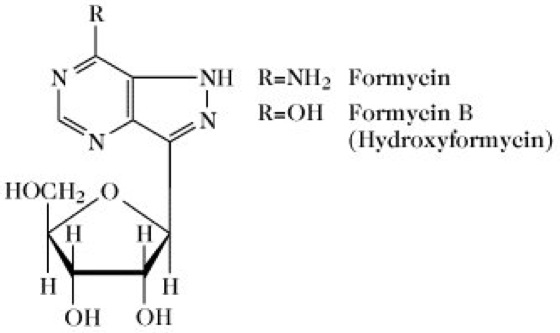 -51,5° (c = 1 in Wasser). Formycin B ist das Desaminierungsprodukt des Formycins und weniger toxisch als dieses. Die Wirkung beschränkt sich vor allem auf Mycobacterium und einige Viren.